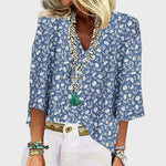 Obohaťte svůj každodenní outfit touto halenkou v modrém odstínu, zdobenou drobnými bílými květinovými vzory. Její klasický střih s tříčtvrtečními rukávy nabízí pohodlí a eleganci, zatímco volný střih z ní dělá vhodnou volbu na jakoukoli příležitost.
