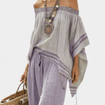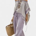 Neformální boho styl s uvolněnou elegancí. Daisy kombinuje top s výstřihem Bardot a nepravidelnými detaily s volnými kalhotami širokého střihu, ideální na pobřežní procházky nebo sluneční odpolední výlety s přirozeným šarmem. Vyrobeno z bambusu s měkkou texturou a volným padáním, nabízí svěžest a lehkost s ručně vyráběným dojmem.