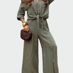 Dámské **celodenní** šaty v khaki barvě s elegantním a pohodlným designem, které vyzařují nenucenou eleganci. Mají **knoflíky nahoře**, pásek na zavázání v pase pro vytvoření ženské siluety a **široké kalhoty s knoflíky na boku**, které dodávají šmrnc a styl. Ideální pro každodenní nošení, ale i pro večerní příležitosti s vhodnými doplňky.