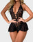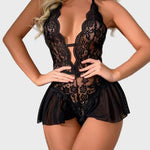 Tato smyslná černá bodystock kombinující krajku a průhledné materiály vytváří naprosto ženský a svůdný vzhled. Díky odvážným výstřihům a květinovým vzorům zvýrazňuje postavu, zatímco krátký volán na spodním okraji dodává šmrnc a eleganci.