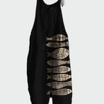 Kunstnerisk Inspiration je jednodílný kostým, který vyniká svým jedinečným designem s dekorativními rybami. Volný střih zajišťuje pohodlí, zatímco černé pozadí s béžovými vzory vytváří unikátní a umělecký vzhled.