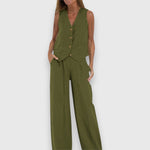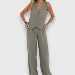 Sada Nina kombinuje letní lehkost s elegantní jednoduchostí – perfektní na teplé dny i stylové příležitosti. Bezrukávý top s úzkým střihem se snoubí s volnými kalhotami, čímž vzniká moderní, lichotivá silueta.
